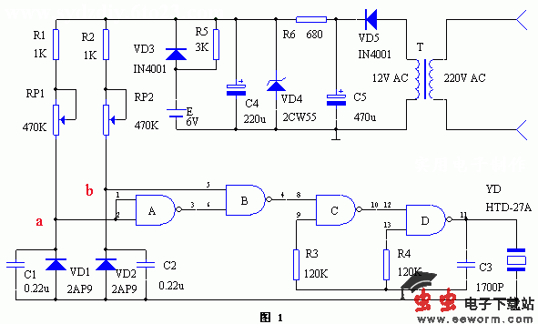 二极管VD1和VD2均置于恒温箱内,当箱内温度低于下限值时,图中a点电位大于门A输入端的阈值电压U,门A输出端为低电平,使门B输出高电平,这时由门C、门D组成的多谐振荡器起振,压电片发出报警声;当箱内温度高于上限值时,b点电位小于门B阈值电压U,也可使门B输出高电平,压电片YD发出报警声。只有当箱内温度处于上、下限之间的值时,YD才不会发出声响。分别调节RP1和RP2的值可分别改变下限和上限值。