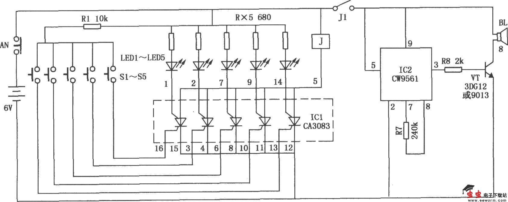 五路报警器电路如图所示,它利用集成电路芯片CA3083构成。平时该电路处于开路状态,电路不耗电,功耗低,可使用干电池供电。