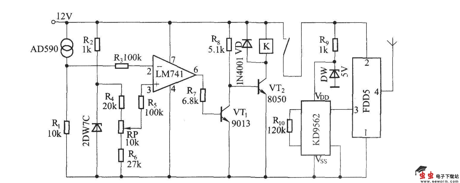 该电路由温度监测电路、无线电发射电路和无线电接收报警电路组成(未画出),如图所示。温度监测电路的作用是当温度超过设定温度标准时,能够接通无线电发射电路的工作电源,使发射电路发出报警信号。