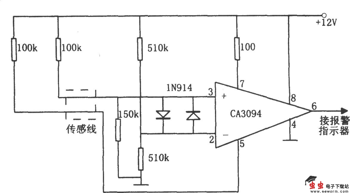 如图所示为多种开关报警器。该电路由集成电路CA3094、传感线、二极管和电源等组成。图中虚线框内的传感线为报警开关。正常情况下,芯片CA3094⑥脚为高电平,电路不报警。当任何一根传感线开路、短接到地或彼此短路时,都会使芯片CA3094⑥脚变成低电平,从而推动报警指示器工作。本电路可以在开路、短路和接地等多种工作状态下通过报警开关实现报警。