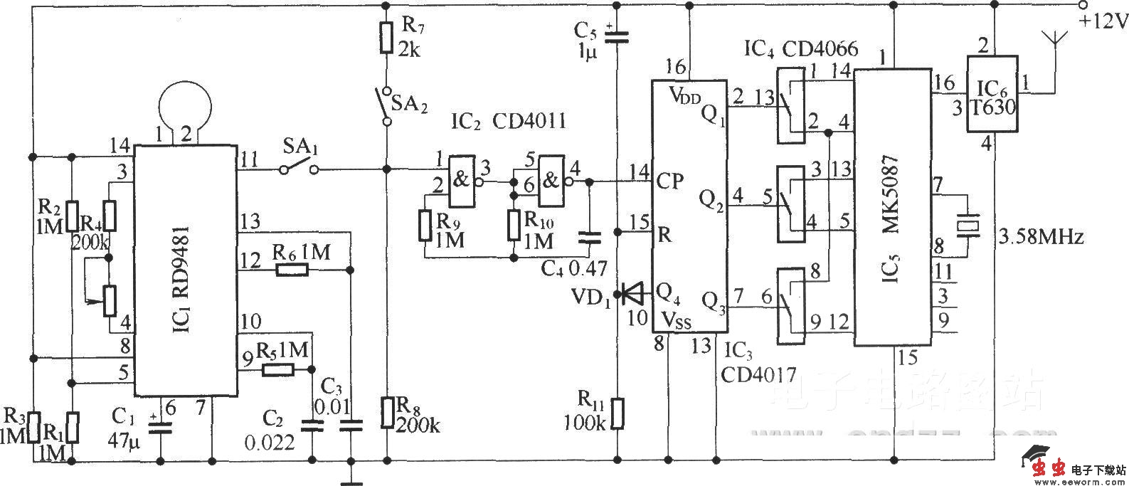 本电路采用微波传感模块RD9481作为探头,使用DTMF(双音多频)编码译码,由长波收发组件T630/T631进行报警信号和地址的传送,可显示报警地点,适用于多路(16路)集群监控报警系统。 本电路由分机和主机组成,除地址编码不同外,各报警分机电路均相同.报警分机电路: