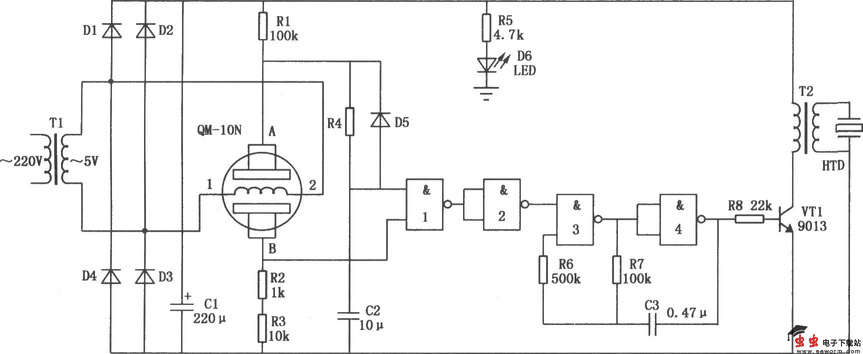 实用煤气泄漏报警器电路如图所示。2输入4与非门集成电路芯片CD4011中的两个与非门3、4组成音频振荡器。QM-10N为气敏传感器,它可以对煤气、液化石油气及瓦斯等进行检测。QM-10N的1、2端为热丝端,加有5V的交流电压。当无有害气体泄漏时,A、B两电极间呈高阻值,与非门l输出为高电平,则与非门2输出为低电平。该低电平加到与非门3的一个输入端,从而使由与非门3、4组成的音频振荡器停振,无信号输出,压电陶瓷片HTD无报警响声发出。当有害气体泄漏时,气体进入气敏传感器,使气敏传感器A、B两电极问的阻值下降,则B端的电位升高,从而触发与非门翻转,与非门l输出低电平,与非门2输出高电平。音频振荡器起振,振荡信号经三极管VTl放大后,通过耦合变压器T2加到压电陶瓷片HTD上,驱动压电陶瓷片HTD发出报警声。
