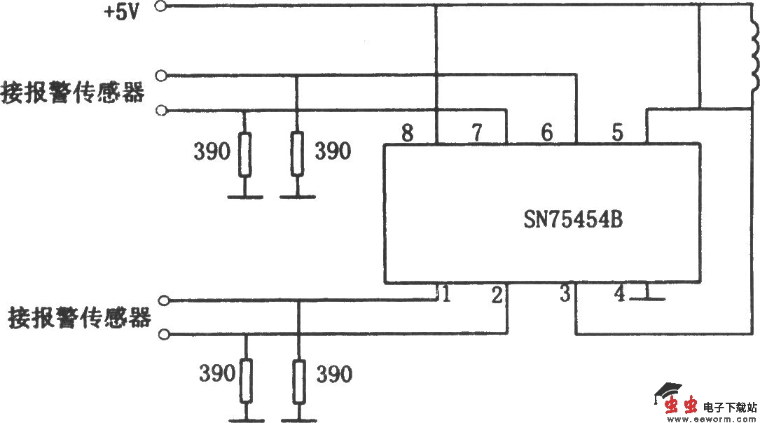 如图所示电路由外部双或非驱动器集成芯片SN75454B、四个不同报警传感器和电源电路等组成。其中芯片SN75454B是由美国得可萨斯仪器公司生产的产品。