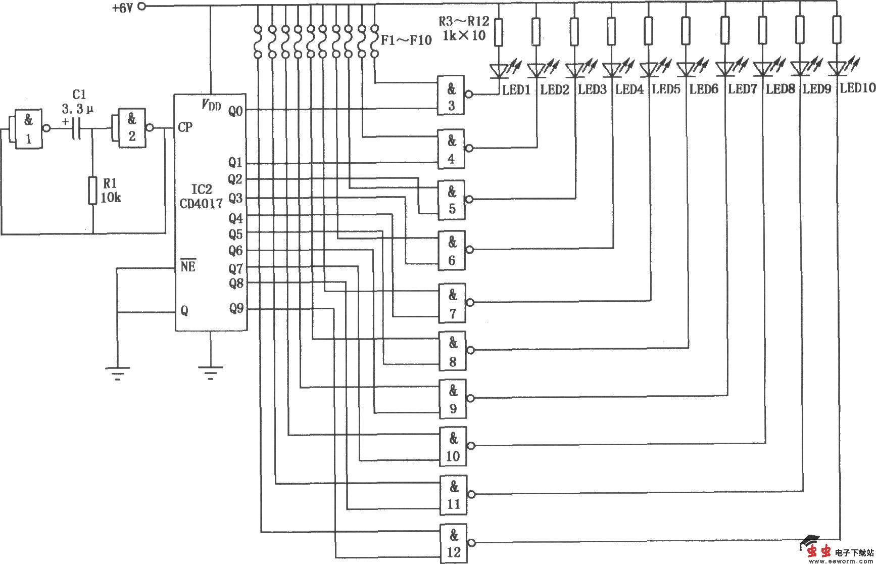 多路防盗报警监视器电路如图所示。它主要由CD4011和CD4017集成电路芯片构成,用指示灯报警和监察。该电路可对10个防盗监测点进行巡回监控,一旦某个监测点发生盗情,则设置在值班室的发光二极管(LED)监控台就能立即得到相应的报警信息