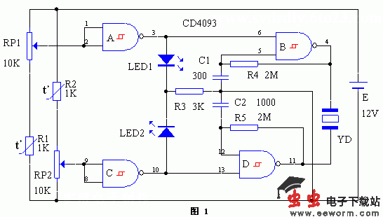 平时RP1、RP2分别设置上限和下限两个报警点,使A和C输入端都为高电平,输出都为低电平而使振荡器都停振。当温度过高时,热敏电阻R1阻值减小,使A输出高电平,B起振,压电陶瓷片YD发出高音调的蜂鸣声。同时,发光二极管LED1亮,显示温度过高。温度过低时,热敏电阻R2阻值增大使C输出高电平,D起振,压电片YD发出低音调的蜂鸣声。发光二极管LED2亮,显示温度过低。