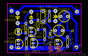 其它元件按照图中标明的选用。 印刷电路板图如下图(点击图片放大),本电路只要安装无误,无须调试即可正常工作应将本机接在电话线路与电话机之间。L1(对应焊盘1)应该接电话线路的正极线,L2(对应焊盘2)应接电话线路的负极线,接反了报警器不能工作。