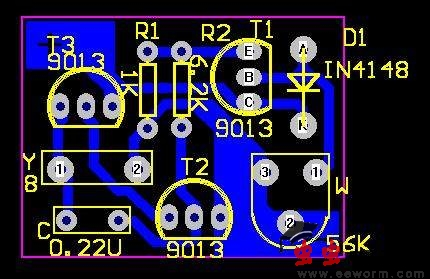 注:印刷电路板图中,采用二极管D1代替感温元件,制作时,如果采用三极管作为感温元件,按电路接法接上即可