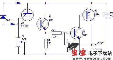 该水开报警器由四只晶体三极管组成,电路如下图所示。图中晶体管T2,T3,电阻R2和电容C等组成音频震荡器,音频信号由喇叭输出。晶体管T1,电阻R1,W及晶体管be结Rt等组成开关电路,作为控制音频震荡器的开关。