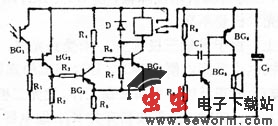 当某种原因有光线照在光敏三极管BG1上时,BG2、BG3均截止,而BG4导通,继电器J得电,其常开触点J1闭合,接通报警电路的电源,则立刻报警发声。