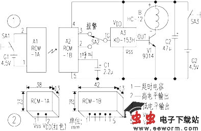 SA2为功能选择开关,当置于“报警”位置时,本装置可用于物品的防盗、防丢、防遗忘。当SA2拨向“呼叫”位置时,因A2第脚只有在接收到A1发射来的电磁波时才会输出高电平(与第脚正好相反),并触发A3工作,使B发声,所以可用作近距离内的无线电单向传呼,如无线遥控门铃、睡眠唤醒器等。C1为延时电容器,它能使A2状态改变迟钝一些,从而增强模块的抗干扰能力。