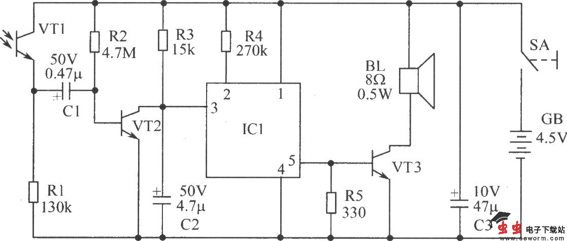如图所示的防盗报警“犬”具有自动报警、灵敏度高、安全可靠、耗电省的特点,可作为家庭防盗、照顾儿童的得力助手。工作原理:防盗报警“犬”的整个电路由光控电子开关和狗叫声语音集成电路两大部分组成。如图是电路原理图。VT1,VT2及R1、R2,R3、C1、C2等构成光控开关电路,IC1及VT3、R4、R5构等构成狗叫声电路。图中的VT1为光敏三极管,平时在周围环境光源照射下,它等效于低阻值电阻器。VT2的基极通过R2接正电位而导通,IC1语音集成电路得不到正脉冲不工作。当VT1被物体遮挡时,就产生一负脉冲电压,通过C1耦合到VT2的基极,导致VT2截止,IC2集成电路获得一正触发脉冲而工作,输出音频信号通过VT3放大后推动扬声器发出“汪、汪”的狗叫声,起到威慑盗贼的作用,闻声逃遁。如果将电子“警犬”置于阳台门等处,还能起到阻止儿童攀登,达到协助家长看护小孩的目的。元器件选择:IC1选用MSS0287-29狗叫声语音集成电路。VT1用3DU5型光敏三极管;VT2、VT3均采用9013型等硅NPN三极管,β≥100。R1~R5为1/8W碳膜电阻器。C1~C3为型铝质电解电容器,耐压值参见图。BL选YD57-1型8Ω、0.5W电动扬声器。SA为小型拨动开关。电源用3节5号电池。其他元器件如图所示。