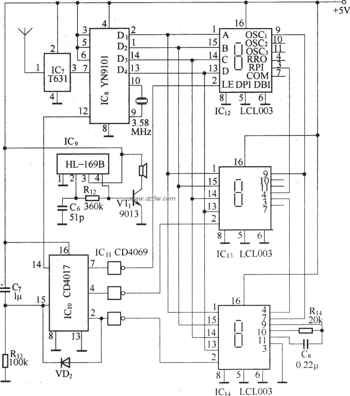 由T630/T631组成的报警电路 CD4066 本电路采用微波传感模块RD9481作为探头,使用DTMF(双音多频)编码译码,由长波收发组件T630/T631进行报警信号和地址的传送,可显示报警地点,适用于多路(16路)集群监控报警系统。 本电路由分机和主机组成,除地址编码不同外,各报警分机电路均相同.报警分机电路: 报警主机电路: