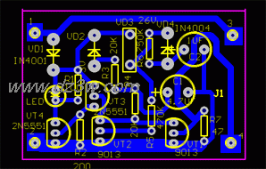 印刷电路板图如下图(点击图片放大),本电路只要安装无误,无须调试即可正常工作应将本机接在电话线路与电话机之间。L1(对应焊盘1)应该接电话线路的正极线,L2(对应焊盘2)应接电话线路的负极线,接反了报警器不能工作。
