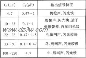 由SGZ07声光报警集成电路构成双频率声光信号源电路 由SGZ07声、光报警集成电路构成双频率声、光信号源电路C1、C2与输出信号对应关系
