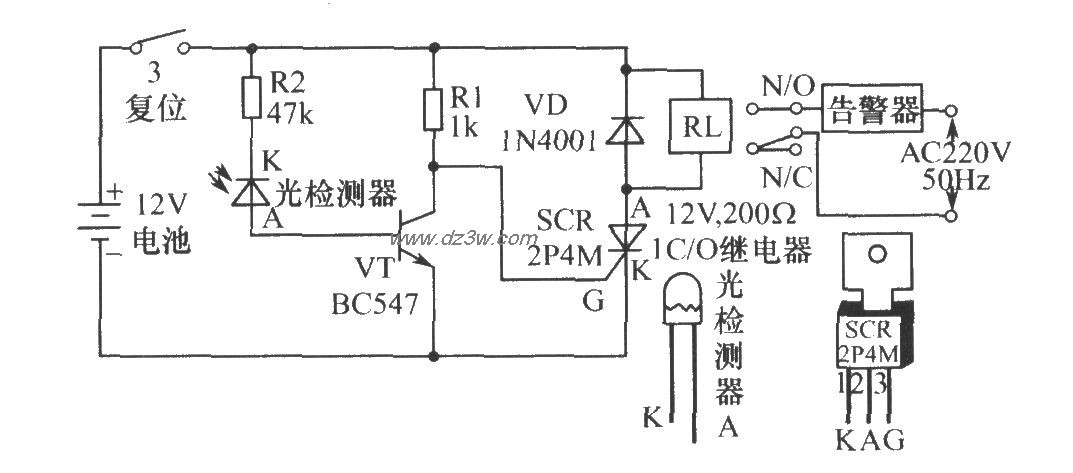 用3V或4.5V电压供电的小型激光枪,由于其激光束很细,传送距离较远,人眼又看不见,因此可用来组成高效的、交叉的防盗光束网,探测有无盗贼闯入。如图是激光防盗系统示意图,它由发射器和接收器两部分组成。从发射器发出的激光束经6只反射镜M1~M6来回反射后送至接收器,接收器中的光检测器只要有激光束照射,就会呈低电阻,引起VT导通,VT的集电极为低电位,这时晶闸管因触发极无触发电流而不导通。如有人闯入激光束探测网区域内,激光束就会被隔断,光检测器呈高电阻,晶体管VT截止,其集电极为高电位,使SCR晶闸管触发导通。继电器RL吸合,其触点闭合,使报警器发出报警。如要终止报警,只要断开一下复位开关S即可。激光束的投射距离视激光强度而定,用4.5V供电的激光枪总射束距离不少于800m;用3V的激光枪约为500m。