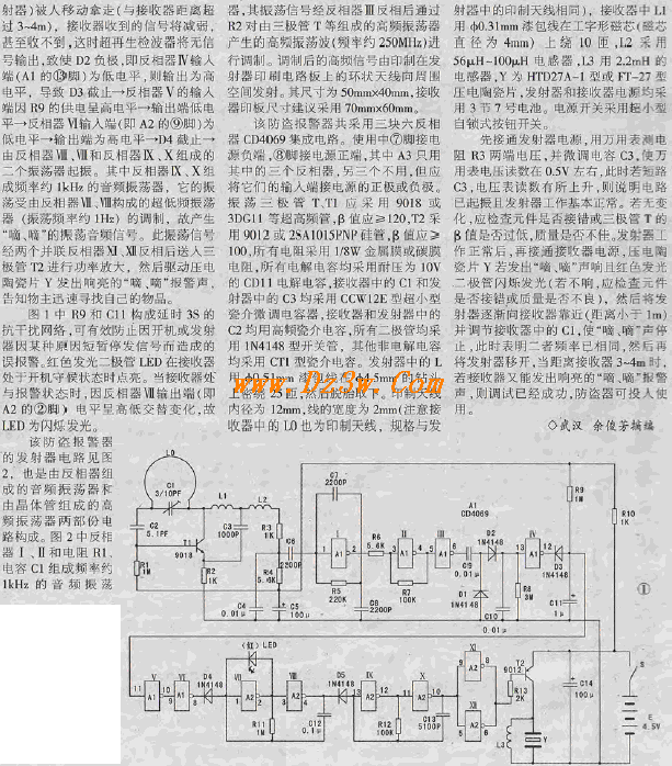 旅行防盗报警器分两部分,一部分为接收器,放在主人荷包里;另一部分为发射器,放置于需要保护的物品中。其中接收器电路见图 1 ,主要由超高频接收及音频信号检出电路、放大电路、倍压整流电路、双音调制音频振荡和驱动及声响电路等组成。工作过程为:当接收器的接收天线L0(PCB印制夭线)接收到发射器发出的超高频(约 250Mllz )信号后,通过三极管Tl 、电感 Ll 、电容 C2 、 C3 等元件组成的超再生检波电路检出1kHz的方波音频信号,然后经电容 C6 耦合至由六反相器A1(CD4069 )I,II,III构成的三级高增益放大器进行放大。图中R5、R7、C7 为稳定放大器工作而设置的负反馈元件,放大后的信号由C9输出,再经 Dl,D2倍压整流后加至反相器V的输人端,因为高电平,所以反相后(A1的12脚)输出低电平,故二极管 D3 导通,因而反相器 V 输人端也为低电平,则输出端( Al的⑩脚)输出高电平,即反相器砚输人端为高电平,显然它的输出端(Al的⑧脚)也输出低电平。因此二极管D4也导通,也就是反相器VII的输人端(即六反相器A2的①脚)被钳位为低电平,此时由反相器VII,VIII和反相器IX,X构成的二个振荡器都不上作.故接收器中的压电陶瓷片 Y 不会发出报警声响。如果被保护的物品(连同发射器.