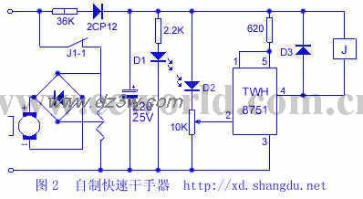当有光照时,IC的1脚为高电位,TWH8751截止,J断电,J1-1断开。当手伸入,挡住光线,D2呈现大电阻,IC的2脚处于低电位,IC输出端导通,J1-1接通,电热丝及电机得电,吹出热气。控制线路的电源由36K电阻及2CP12降压整流获得+18V左右电压。电热丝选用1KW的,呈螺旋型盘在电机下面,快速干手器外壳主要尺寸及元件安排位置见图1。