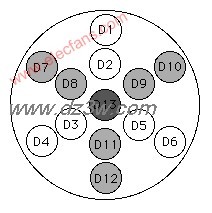 Parts:R1_____________10K1/4WResistorR2,R9,R10_____100K1/4WResistorsR3-R8,R11-R16__10R1/4WResistorsR17___________150R1/4WResistorC1______________1΅F63VPolyesterCapacitorC2_____________10nF63VPolyesterCapacitorC3____________100΅F25VElectrolyticCapacitorD1-D13_____RedLEDs5mm.orbigger,highefficiencyIC1,IC2________7555orTS555CNCMosTimerICSW1____________SPSTSliderSwitchB1_______________3VBattery(2AA1.5VCellsinseries)Devicepurpose:Thiscircuithasbeendesignedtoprovideaclearlyvisiblelight,formedby13highefficiencyflashingLEDsarrangedinapseudo-rotatingorder.Duetolowvoltage,lowdrainbatteryoperationandsmallsize,thedeviceissuitableformountingonbicyclesasabacklight,ortoputonbyjogger/walkers.Circuitoperation:IC1isaCMosversionofthe555ICwiredasanastablemultivibratorgeneratinga50%duty-cyclesquarewaveatapprox.4Hzfrequency.At3Vsupply,555output(pin3)sinkingcurrentoperationisfarbetterthansourcing,thenLEDD1-D6areconnectedtopositivesupply.Inordertoobtainanalternateflashingoperation,asecond555ICisprovided,actingasatriggerplusinverteranddrivingLEDsD7-D12.D13ispermanentlyon.TheLEDsarearrangedinatwoseriesdisplayasshownbelow,withacenterLEDpermanentlyon.ThisarrangementandthealternateflashingofthetwoseriesofLEDsprovideapseudo-rotatingappearance.LEDarrangement: