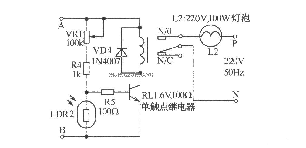如图所示接收器可避免遗漏病人的求助声音,在白天,只有接收器本身工作,照明灯部分则自动切断。在夜里接收器和照明信号可同时随病人的请求送出。呼叫开关按下时,变压器X1初级也同时与交流电源接通,次级电压经整流、滤波后,其输出直流电压经R1送至VT1集电极。如果在白天,因受光线照射,光敏电阻LDR1呈低阻状态,VT1导通,其集电极拉至地电位,因此晶闸管BT136不工作,这时只有呼叫铃声可以听到,照明信号则处于无效状态。在夜间,LDR1因黑暗而呈高阻状态,因此在S1按下后,VT1截止,使滤波后的正直流电压可经R1和R3对晓充电。VD3的作用可使恒定的直流正偏压触发BT136,从而使白炽灯L1发光,因此在夜问既可听到铃声,又可看到求助的照明信号。齐纳二极管ZD1用来限制C2两端的电压维持在设定的稳定值。A、B点右侧的电路部分也可更换成下图所示电路,不用晶闸管而用继电器来控制照明灯。在白天,因LDR2的低电阻旁路了VT2的基极电流使VT2截止,继电器RL1不工作。在晚上,LDR2几乎呈开路状态,基极电流经VR1、R4和R5流入基极使VT1导通,RL1吸合,灯泡L2发光。