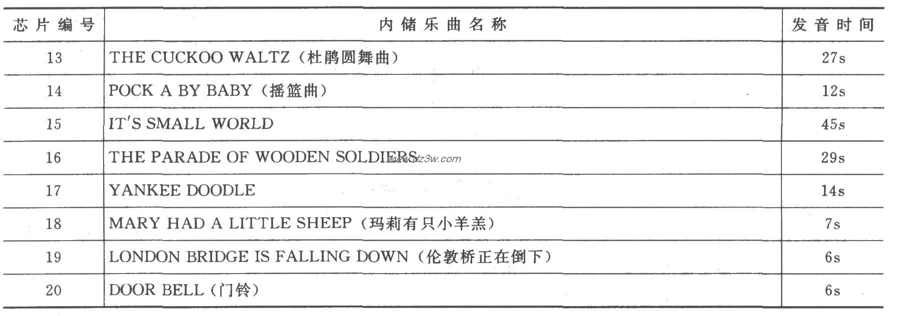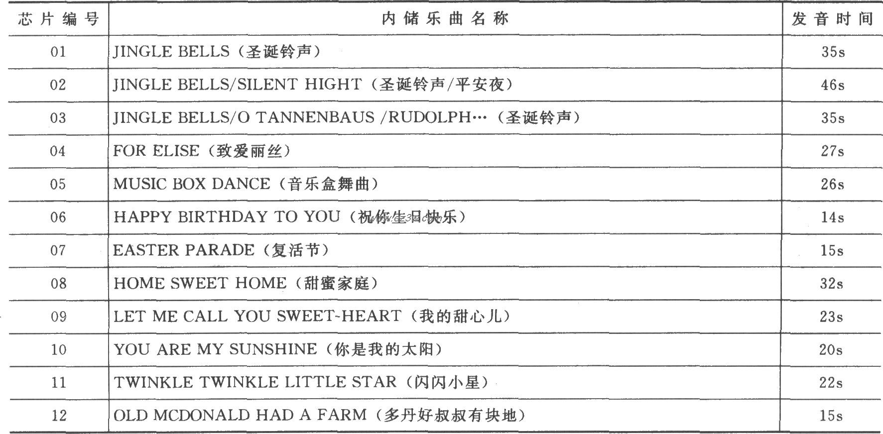 VT66/66A三极管型音乐集成电路 VT66/66A采用TO92形式封装,其外形与塑封9013型晶体三极管酷似,且自身带有一块金属散热片,有3只引出脚,使用时与一般晶体三极管一样方便,故也有人称它为音乐三极管。如图所示为其典型应用电路。VT66/66A内储乐曲名和芯片编号关系: