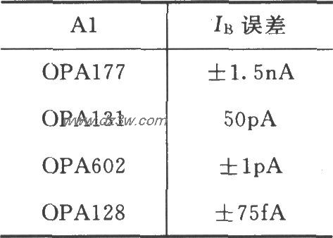 如图所示为由INA141构成的差分电压-电流变换电路。INA141输出经R1及A1构成电流源,因运算放大器输入阻抗极高,偏流极小,与输出至负载的电流相比可忽略不计,因此输出电流Io可以看作是恒定的,Io=(VIN/R1)G。A1选型及IB误差见下表。当R1固定时,输出电流只与输人电压VIN有关,即可完成差分电压-电流变换。