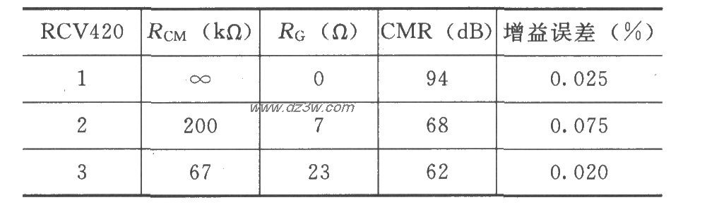 如图所示,RCM和RG分别用于提供一阶CMR和增益误差的修正。当3个RCV420重叠使用时,下表给出了典型的RCM、RG的阻值,以及没有修正的典型CMR和增益误差。如需进一步改进CMR和增益误差,可将RCM和RG用500kΩ电位器细调。