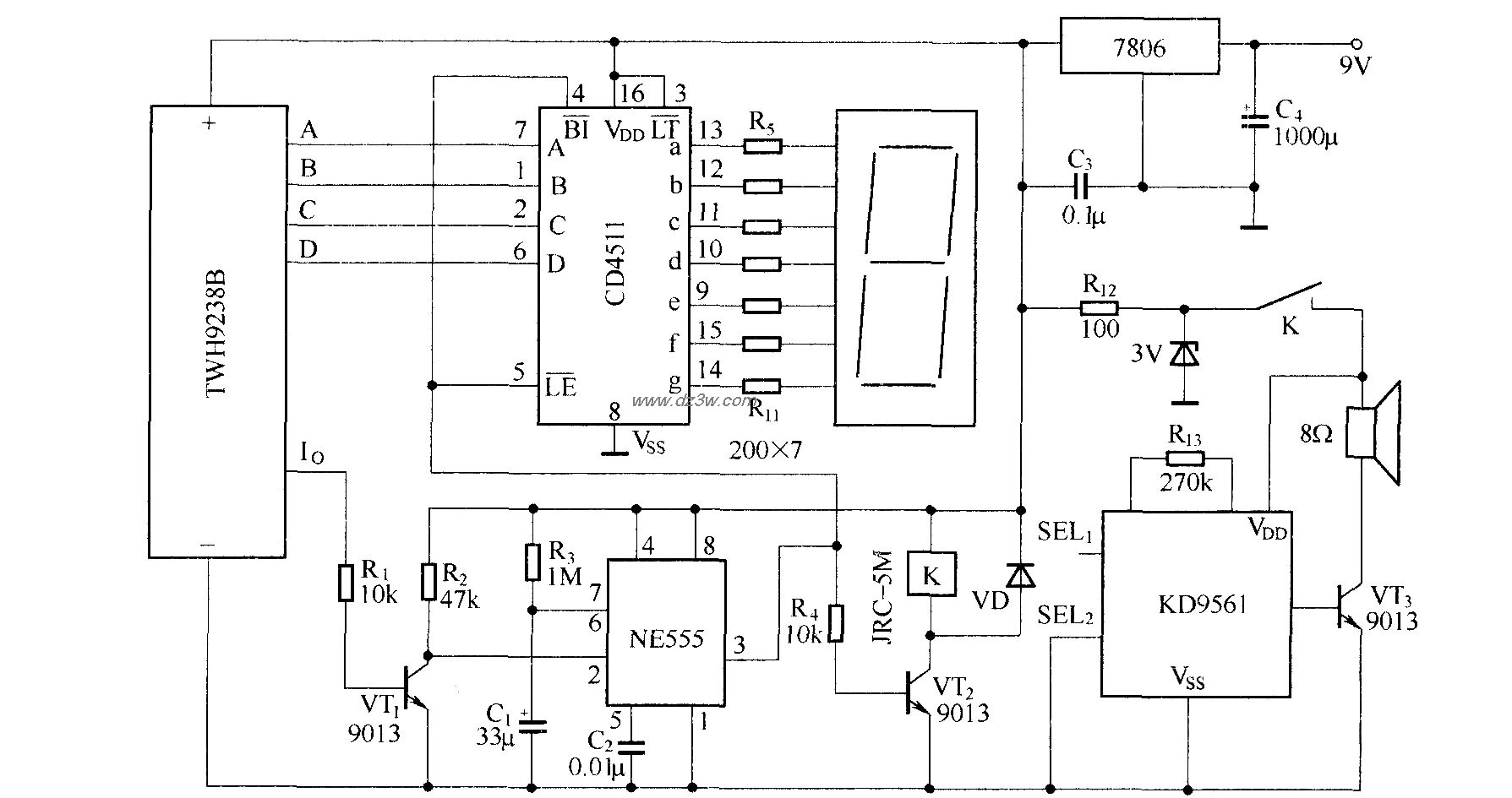 呼叫发射电路: 呼叫接收电路: 呼叫声响电路由发声电路KD9561和扬声器组成,它受控制电路的控制而发声。当接收电路接收解码有效时,Io输出一个正向脉冲,这一脉冲通过控制电路使继电器K吸合,接通KD9561的工作电源使其发声。