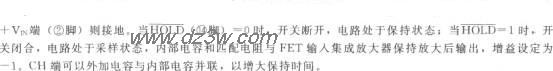 如图所示为AD585增益=-1时的有效采样保持电路。信号由RIN端(10脚)输入,而