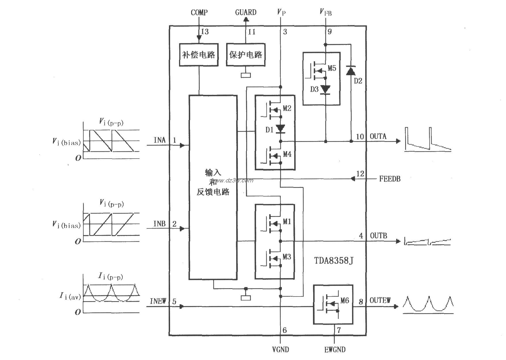TDA8358J是90o和110o彩色偏转系统的功率电路,可用于4:3和16:9显像管。电路提供一个DC驱动垂直偏转输出电路,东-西输出级能够为二极管调节器吸入电源电流。TDA8358J的引脚排列及功能如图所示。