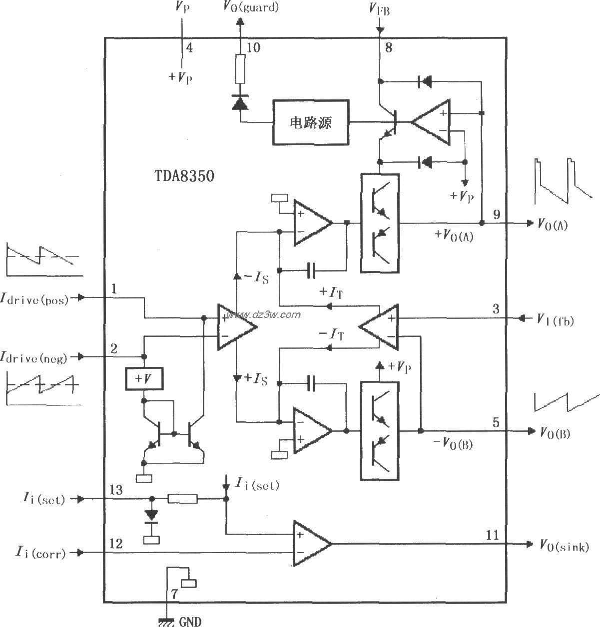 TDA8350Q是用于90o和110o彩色偏转系统的功率电路,场频为50~120Hz。电路提供一个DC驱动垂直偏转输出电路(工作于高效率G级系统),一个吸入二极管调节器电流的东-西驱动器。TDA8350Q具有一个信号变换电阻的东-西输出级、高EMC抑制(输入共模信号)和垂直回扫开关。TDA8350Q的引脚排列及功能如图所示。