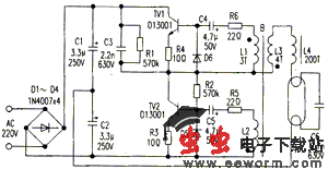U形节能灯电子镇流器具有功率因数高、 节能、低温低压启动快、无频闪、价廉及重量轻等优点。 220V交流电源经整流、滤波后,形成330V左右的直流电压通过R1、R2对开关三极管提供正偏电流,使TV2导通;并经高频变压器B耦合,TV1、TV2交替导通,输出方波脉冲电压。此脉冲电压经过电感L、灯丝电阻、电容C6组成的串联谐振电路,在C6两端产生高电压,使灯管在高频高压下点亮。灯管点亮后,L起限流的作用。