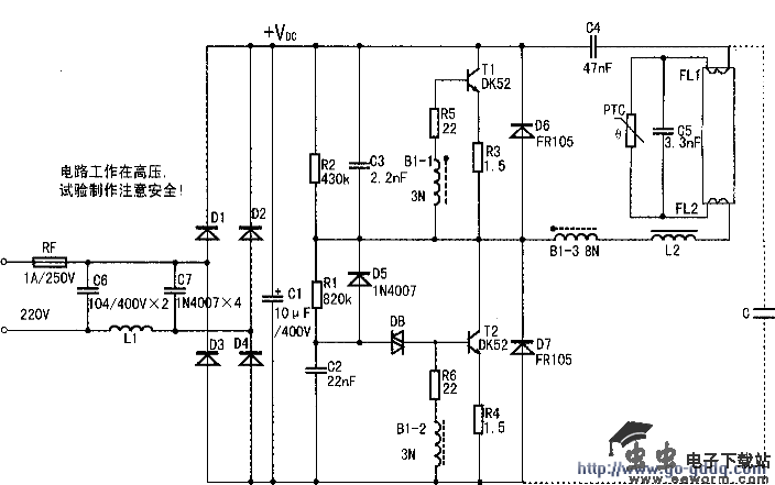 由T1、T2、R3、R4、R5、R6、B1—1、B1—2、B1—3等组成变异的变压器馈电半桥式逆变电路。在荧光灯电子镇流器中逆变器是最关键的组成部分之一。它实质上是一个DC/AC变换电路,用以产生20kHz以上的高频电压和电流。之所以称之为变异电路是因为在其桥路的无源侧少了一个连接于灯丝与地之间的电容C(常规电路有这个电容如图中虚线所示。由T1、T2和C4、C构成电桥),逆变的核心元件T1、T2同时兼做功率开关之用,它们占电桥电路的一半,所以称之为半桥式逆变器。D6、D7分别并接于T1、T2的集电极与发射极之间。起续流保护之用。