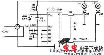 CD71061P构成的交流彩灯群控制电路原理如图所示。220V市电经全桥U整流后,由电阻R1限流降压,C1滤波,VDW将其电压稳定在5.6V左右供给ICCD71061P工作。由IC的输出端Q1~Q8输出的脉冲信号使单向可控硅VS1~VS8导通,从而驱动群H1~H8作各种花样闪烁。