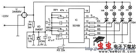 由5G169构成的四路亮度可变彩灯串控制电路原理如图所示。220V市电经全桥U整流、电阻R1限流降压,并与R2分压,由VDW将其电压稳定在6V,经二极管VD后,由电容器C1滤波后供给IC5G169工作。RP1是亮度分级调整用电位器,改变其阻值可使彩灯亮度分为64个等级。RP2是速度变化调整用电位器,改变其阻值可使彩灯亮、熄转换的变化速度相应改变,其R值大时则变化慢,反之则变化快。其可调范围为0.1~5s之间。S是彩灯正、反循环方向控制键,当S断开时,IC的(13)脚处于高电平状态,此时输出端(9)、(10)、(11)、(12)顺序输出高电平,使彩灯串按H1→H2→H3→H4方向顺序流动;当S闭合时,IC的(13)脚处于低电平状态,此时输出端(12)、(11)、(10)、(9)脚顺序输出高电平,使彩灯串按H4→H3→H2→H1??方向逆向流动。