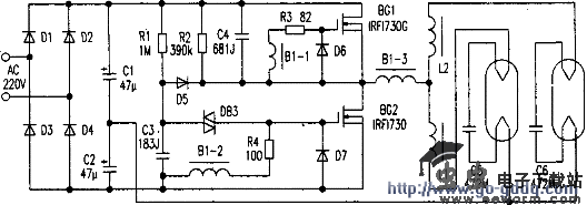 交流市电经整流滤波后,在电容C1、C2两端产生300V左右的直流电压。该电压经R1对C3充电,使C3上电压迅速升高。当C3上的电压超过32V时,触发二极管DB3导通,从而使BG2迅速饱和导通。BG2导通后,C3开始放电,C3电压下降。与此同时,由于耦合变压器B1的各绕组同名端反馈的作用,其第一绕组B1-1感应的电压使BG1由截止进入导通状态;同时第二绕组B1-2感应的电压使BG2由导通变为截止。就这样周而复始,两个三极管BG1、BG2的轮流导通和截止,就形成了高频振荡。该高频信号使L1和C5、L2和C6组成的串联谐振电路产生谐振,在C5和C6两端产生很高的电压,从而激活灯管内壁荧光粉,促使灯管发光。在灯管点亮后,L1和C5、L2和C6组成的串联谐振电路失谐,C5和C6基本不再起作用,而L1和L2起限流作用。