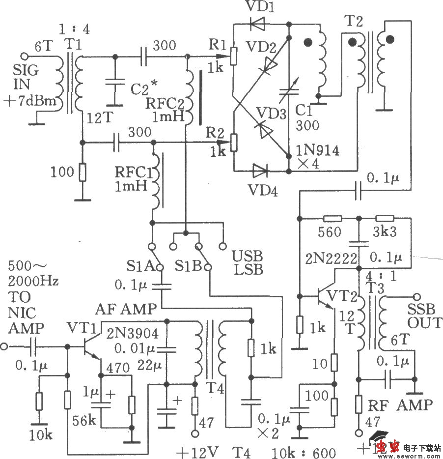 自制SSB发射机,对HAM来说,是一个挑战,也是对自身实力的一个检验。但目前国内很少有HAM能够自制SSB发射机,究其原因,主要是因为SSB发射机的核心部件晶体滤波器及其配用的晶振(如9MHz晶体滤波器所配用的8998.5kHz、9001.5kHz晶振)在国内难以购到,在这种情况下,可以采用移相法产生SSB信号,与常用的滤波法相比,移相法对无用边带抑制略差一点,但是它具有制作容易,成本低的优点,尤为突出的是—VFO(应具有相当高的频稳度)的输出频率可直接取为发射频率,不必再经过一次或多次变频,大大简化了整机电路设计,电路如图所示。