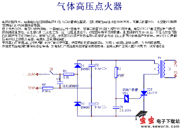 按下开关Q1时,电容C4开始充电,一旦电压达到一定电平,雪崩二极管VS1和可控硅VS2都导通。电容C2和 C3通过变压器T1的初级绕组迅速放电。在电容C2和 C3充电之后,这一过程重复进行。对应图中所示元件数值,重复频率约为10-30HZ,于是在放电间歇F1F2间产生连续的电火花,使煤气点燃。变压器T1次级产生的高压应能使距离为10-12mm的两个放电端产生放电。电容C1-C3是耐压400V以上的纸介电容。电阻R1应采用线饶的。