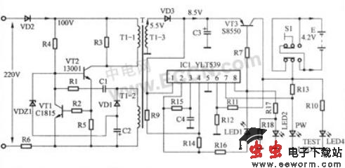 该电路主要由一块软塑封集成块IC1(YLT539)和三极管VT3等组成。从变压器T的1-3绕组感应出的交流电压5.5V经二极管VD3整流、电容C3滤波后,输出一个直流8.5V左右电压(空载时),该电压一部分加到三极管VT3的e极;另一部分送到软塑封集成块IC1(YLT539)的1脚,为其提供工作电源。集成块IC1有了工作电源后开始启动工作,在其8脚输出低电平充电脉冲,使三极管VT3导通,直流8.5V电压开始向电池E充电。