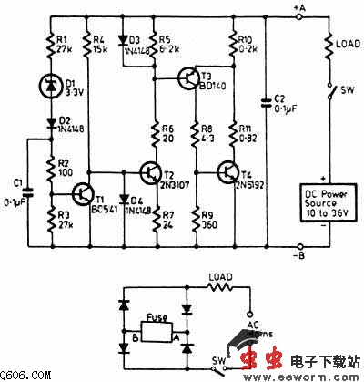 负载电流流过三极管T4、电阻R10和R11。A、B端的电压与负载电流成正比,大多数的电压分配在电阻上。 当电源刚刚接通时,全部电源电压加在保险上。三极管T2由R4的电流导通,其集电极的电流值由下式确定:VD4=VR7+0.6。因为D4上的电压(VD4)和R7上的电压(VR7)是恒定的,所以T2的集电极电流也是恒定。该三极管提供稳定的基极电流给T3,因而使其导通,接着又提供稳定的基极电流给T4。保险导电,负载有电流流过。当电源刚接通时,电容器C1提供一段延时,从而避免T1导电和保持T2断开。