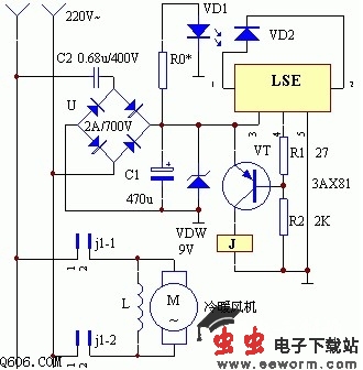 该装置的电路工作原理见图9。平时红外线发光管VD1发射的红外线照射在红外线接收管VD2上,导致VD2的内阻变小,故LSE的④脚此时输出高电平,此时三极管VT截止,继电器J处于释放状态,其常开触点j1-1、j1-2断开,冷暖风机无电源不工作。当人洗完手后,将手伸至VD1与VD1之间,遮挡了由VD1发出的红外线,此时VD2的内阻增大,相当于LSE①、②脚开路,于是 LSE的④脚输出低电平,三极管VT导通,继电器J励磁吸合,其触点断电。冷暖风机应预先接入电网中,并将机器上的“热风”开关揿下。