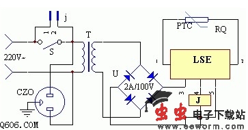 该装置的电路工作原理见图8。先在电水壶上用环氧树脂沾牢一只片状正温度系数的 开关型热敏电阻RQ。将RQ的两端接到LSE的①、②脚,将水壶插入电源插座CZO中,揿下电源开关S,此时由于电水壶中的水温较低,RQ的阻值较小 (<50K),故LSE的④脚输出高电平,继电器J立即吸合,常开触点j闭合,电水壶通电工作。松开手后,继电器J触点自保。一旦水沸腾 (100℃),RQ的阻值阶跃上升,远大于50K,相当于LSE的①、②脚回路断开,故LSE的④脚输出低电平,J释放,其触点j断开,彻底切断了电水壶 的
