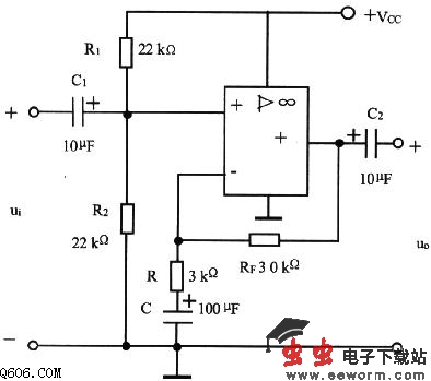 电源Vcc通过R1和R2分压,使运放同相输入端电位由于C隔直流,使RF引入直流全负反馈。所以,静态时运放输出端的电压V0=V-≈V+=+Vcc/2;C通交流,使RF引入交流部分负反馈,是电压串联负反馈。放大电路的电压增益为