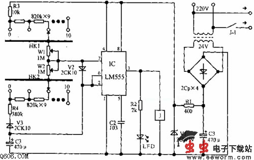 电器开停循环定时器电路如下图所示,LM555时基集成电路组成占空比可调的多谐振荡器,在C3的充放电回路串入KH1、W1、KH2、W2,分别作为电器开、停时间的粗调和微调。电路开始工作时,电源通过R3、HK1的串联电阻及W1、V2向C3充电,IC的3脚输出高电平,LED发亮,继电器J吸合,其触点接通负载。当C3上电压上升到2/3电源电压时,IC翻转,继电器释放。同时,C3经V3、R4、HK2上串联的电阻W2及IC的7脚对地放电。当C3电压下降到1/3电源电压时,IC翻转,继电器吸合。如此循环工作。HK1、HK2每挡可延时增减4.5分钟,W1、W2的调节范围约为0~5分钟。