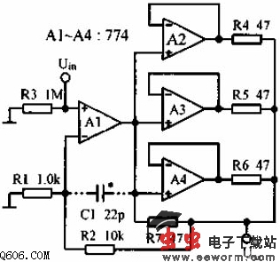 同相复合直流放大器电路如下图所示,采用四运放774实现其并联工作,它能驱动500Ω的负载,在±10V范围内线性度良好。