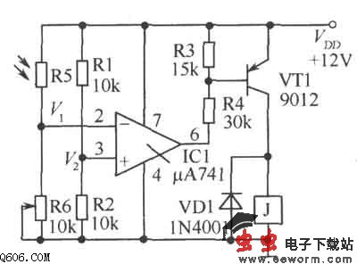 如图所示的电路为一种精密光亮光控电路,其工作不受电源电压及环境温度的影响。电阻R1、R2、R6及光敏电阻R5共同构成惠斯顿电桥的两个桥臂。