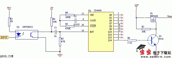 如上图:电路工作的时候只要定时给CD4060复位脉冲,就能保证Q1处于截至状态,从而使受控的NMOS管处于导通状态给处理器电路系统供电。