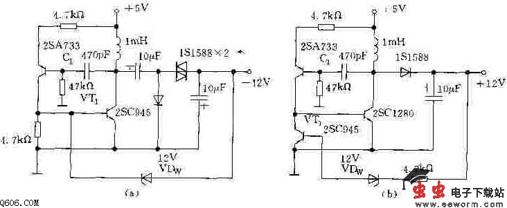 下图是采用晶体管构成的小功率DC/DC变换器电路。其中,图(a)是把+5V输入电压变换为-12V输出电压的电路,图(b)是把+5V输入电压变换为+12V输出电压的电路。对于任一电路,若输出电压超过稳压管VDw的稳定电压,就对驱动晶体管VT1施加负反馈,使输出电压保持恒定。因此、输出电压等于稳压管的稳定电压,若改变稳定电压就可以输出电压进行调节。