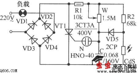 如图所示,此电路能根据外界光线的强弱来自动调节灯光亮度。若外界亮度高,灯光就暗,反之外界亮度低,灯光就亮。图中由晶闸管VT1和二极管VD1~VD4组成全波相控电路,用氖管N作VT1的触发管。调节W可改变对电容C的充电时间常数,即改变VT1的导通角,控制灯光的亮度。