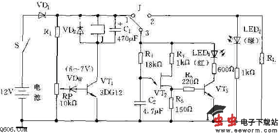 下图是电池放电控制指示电路,它由R1、RP、VDw,VT1和J组成过放电控制电路:R3,C2,VT2和VT3组成过放电指示电路,接通开关S,电池电压R1,RP分压击穿VDw使VT1饱和导通,继电器J工作,1.3常开触点接通,绿色LED2发光,负载R1得电工作,当电池电压降至原先设定的10~10.5V时,R1和RP分压不能击穿VDw,使VT1不能饱和导通,继电器J停止工作。1.3常开触点断开,1.2常闭触点接通,绿色LED2熄灭,负载R2停止工作。电池电压经过R3对C2充电(充电时间由R3、C1决定),使VT2,VT3断续导通,红色LED1闪烁,提示用户,此时电池已经欠压,应给电池充电,避免电池因过放电而损坏。