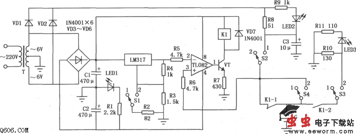 本电路能使两节镉镍电池在充电至3V或放电至l.34V时,自动切断充电或放电回路,有效地防止过充电或过放电现象。